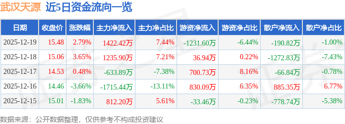 证券之星消息,截至2025年12月19日收盘,武汉天源(301127)报收于15.48元,上涨2.79%,换手率1.86%,成交量12.38万手,成交额1.91亿元。
