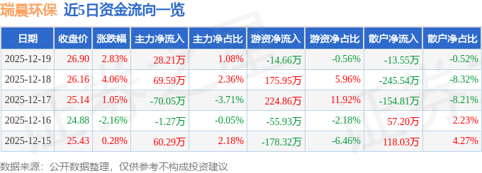 证券之星消息,截至2025年12月19日收盘,瑞晨环保(301273)报收于26.9元,上涨2.83%,换手率1.79%,成交量9843.0手,成交额2614.35万元。