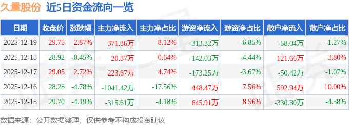 证券之星消息,截至2025年12月19日收盘,久量股份(300808)报收于29.75元,上涨2.87%,换手率1.31%,成交量1.56万手,成交额4571.89万元。