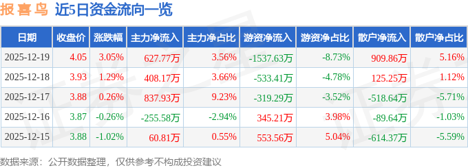 证券之星消息,截至2025年12月19日收盘,报 喜 鸟(002154)报收于4.05元,上涨3.05%,换手率3.72%,成交量43.85万手,成交额1.76亿元。