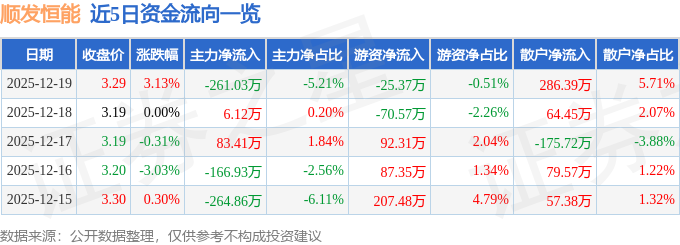 证券之星消息,截至2025年12月19日收盘,顺发恒能(000631)报收于3.29元,上涨3.13%,换手率0.64%,成交量15.32万手,成交额5012.31万元。