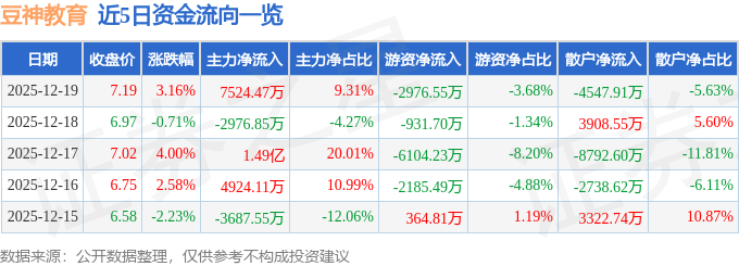 证券之星消息,截至2025年12月19日收盘,豆神教育(300010)报收于7.19元,上涨3.16%,换手率6.8%,成交量113.13万手,成交额8.08亿元。