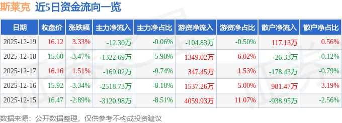 证券之星消息,截至2025年12月19日收盘,斯莱克(300382)报收于16.12元,上涨3.33%,换手率2.0%,成交量12.99万手,成交额2.08亿元。