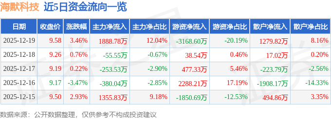 证券之星消息,截至2025年12月19日收盘,海默科技(300084)报收于9.58元,上涨3.46%,换手率4.79%,成交量16.49万手,成交额1.57亿元。