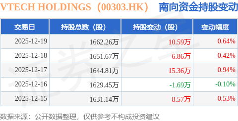 证券之星消息,12月19日南向资金增持10.59万股VTECH HOLDINGS(00303.HK)。近5个交易日中,获南向资金增持的有4天,累计净增持39.69万股。近20个交易日中,获南向资金增持的有16天,累计净增持276.97万股。截至目前,南向资金持有VTECH HOLDINGS(00303.HK)1662.26万股,占公司已发行普通股的6.56%。