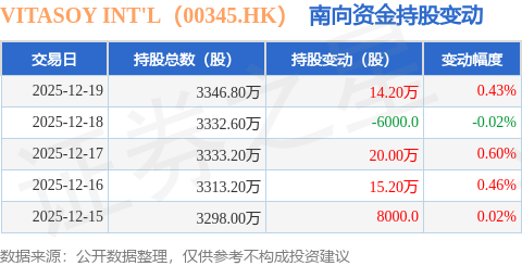 证券之星消息,12月19日南向资金增持14.2万股VITASOY INT'L(00345.HK)。近5个交易日中,获南向资金增持的有4天,累计净增持49.6万股。近20个交易日中,获南向资金增持的有14天,累计净增持158.2万股。截至目前,南向资金持有VITASOY INT'L(00345.HK)3346.8万股,占公司已发行普通股的3.2%。