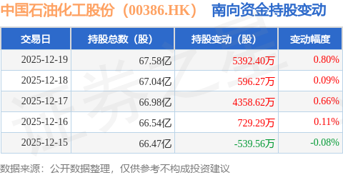 证券之星消息,12月19日南向资金增持5392.4万股中国石油化工股份(00386.HK)。近5个交易日中,获南向资金增持的有4天,累计净增持1.05亿股。近20个交易日中,获南向资金增持的有13天,累计净增持1.57亿股。截至目前,南向资金持有中国石油化工股份(00386.HK)67.58亿股,占公司已发行普通股的28.21%。