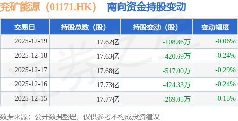证券之星消息,12月19日南向资金减持108.86万股兖矿能源(01171.HK)。近5个交易日中,获南向资金减持的有5天,累计净减持1739.93万股。近20个交易日中,获南向资金减持的有15天,累计净减持5533.84万股。截至目前,南向资金持有兖矿能源(01171.HK)17.62亿股,占公司已发行普通股的43.24%。