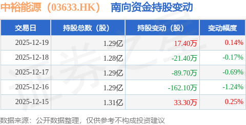 证券之星消息,12月19日南向资金增持17.4万股中裕能源(03633.HK)。近5个交易日中,获南向资金减持的有3天,累计净减持222.5万股。近20个交易日中,获南向资金减持的有16天,累计净减持1232.0万股。截至目前,南向资金持有中裕能源(03633.HK)1.29亿股,占公司已发行普通股的4.67%。