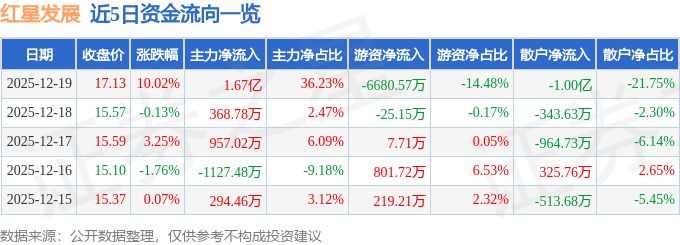 证券之星消息,截至2025年12月19日收盘,红星发展(600367)报收于17.13元,上涨10.02%,涨停,换手率8.48%,成交量27.31万手,成交额4.61亿元。