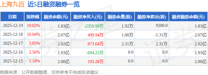 证券之星消息,截至2025年12月19日收盘,上海九百(600838)报收于11.09元,上涨10.02%,已连续涨停2天,换手率18.01%,成交量72.21万手,成交额7.82亿元。
