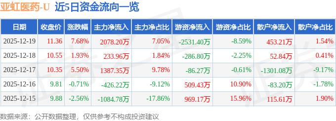 证券之星消息,截至2025年12月19日收盘,亚虹医药(688176)报收于11.36元,上涨7.68%,换手率5.97%,成交量26.01万手,成交额2.95亿元。