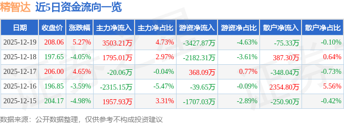 证券之星消息,截至2025年12月19日收盘,精智达(688627)报收于208.06元,上涨5.27%,换手率4.96%,成交量3.59万手,成交额7.41亿元。