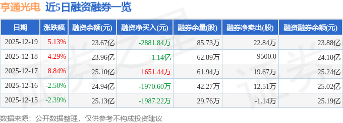 亨通光电融资融券信息显示,融资方面,当日融资买入4.83亿元,融资偿还5.12亿元,融资净偿还2881.84万元。融券方面,融券卖出27.8万股,融券偿还4.96万股,融券余量85.73万股,融券余额2037.03万元。融资融券余额23.88亿元。