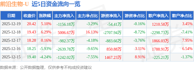 证券之星消息,截至2025年12月19日收盘,前沿生物(688221)报收于20.42元,上涨5.1%,换手率4.6%,成交量17.24万手,成交额3.51亿元。