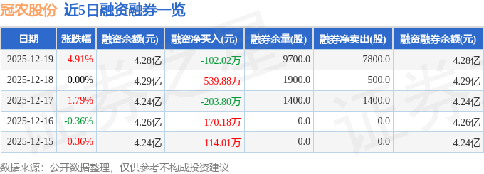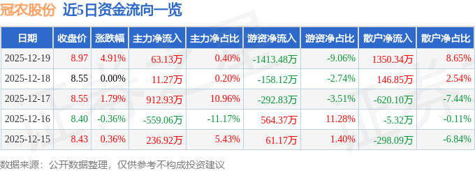 证券之星消息,截至2025年12月19日收盘,冠农股份(600251)报收于8.97元,上涨4.91%,换手率2.27%,成交量17.68万手,成交额1.56亿元。