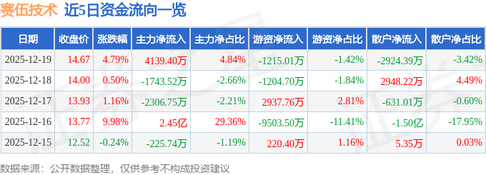 证券之星消息,截至2025年12月19日收盘,赛伍技术(603212)报收于14.67元,上涨4.79%,换手率13.36%,成交量58.47万手,成交额8.56亿元。