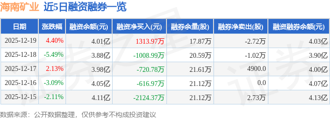 海南矿业融资融券信息显示,融资方面,当日融资买入5319.96万元,融资偿还4006.0万元,融资净买入1313.97万元。融券方面,融券卖出1.92万股,融券偿还4.64万股,融券余量17.87万股,融券余额186.38万元。融资融券余额4.03亿元。