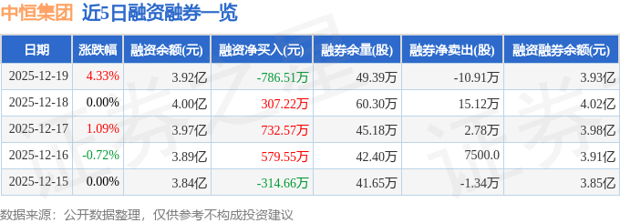中恒集团融资融券信息显示,融资方面,当日融资买入2594.37万元,融资偿还3380.88万元,融资净偿还786.51万元。融券方面,融券卖出300.0股,融券偿还10.94万股,融券余量49.39万股,融券余额142.74万元。融资融券余额3.93亿元。