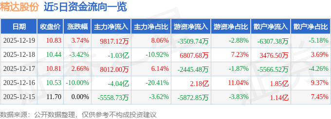 证券之星消息,截至2025年12月19日收盘,精达股份(600577)报收于10.83元,上涨3.74%,换手率5.26%,成交量113.06万手,成交额12.18亿元。