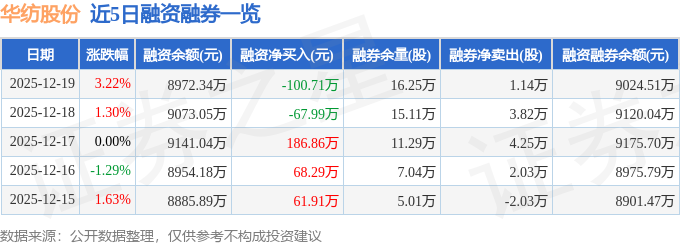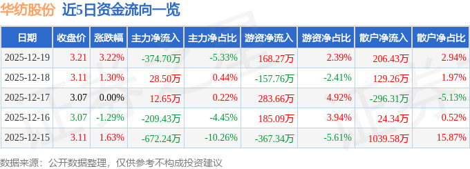 证券之星消息,截至2025年12月19日收盘,华纺股份(600448)报收于3.21元,上涨3.22%,换手率3.51%,成交量22.11万手,成交额7027.07万元。