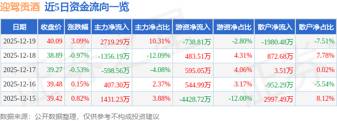 证券之星消息,截至2025年12月19日收盘,迎驾贡酒(603198)报收于40.09元,上涨3.09%,换手率0.83%,成交量6.65万手,成交额2.64亿元。