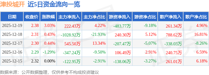 证券之星消息,截至2025年12月19日收盘,津投城开(600322)报收于2.38元,上涨3.03%,换手率2.01%,成交量22.27万手,成交额5269.39万元。