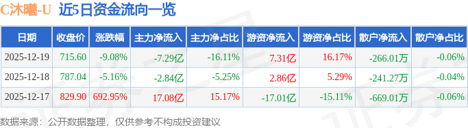 证券之星消息,截至2025年12月19日收盘,C沐曦(688802)报收于715.6元,下跌9.08%,换手率33.89%,成交量6.15万手,成交额45.22亿元。