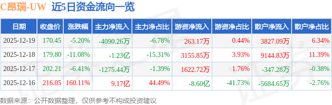 证券之星消息,截至2025年12月19日收盘,C昂瑞(688790)报收于170.45元,下跌5.2%,换手率29.0%,成交量3.5万手,成交额6.04亿元。