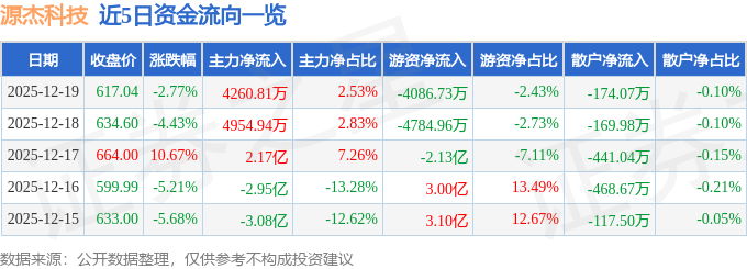 证券之星消息,截至2025年12月19日收盘,源杰科技(688498)报收于617.04元,下跌2.77%,换手率4.45%,成交量2.68万手,成交额16.84亿元。