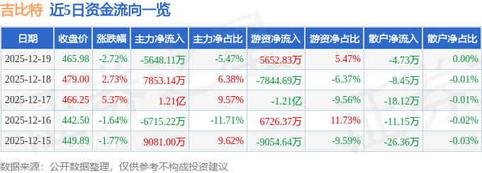 12月19日的资金流向数据方面,主力资金净流出5648.11万元,占总成交额5.47%,游资资金净流入5652.83万元,占总成交额5.47%,散户资金净流出4.73万元。