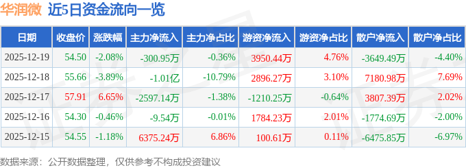 证券之星消息,截至2025年12月19日收盘,华润微(688396)报收于54.5元,下跌2.08%,换手率1.14%,成交量15.08万手,成交额8.3亿元。