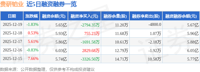 贵研铂业融资融券信息显示,融资方面,当日融资买入1.13亿元,融资偿还1.41亿元,融资净偿还2794.35万元。融券方面,融券卖出1000.0股,融券偿还5800.0股,融券余量11.2万股,融券余额210.0万元。融资融券余额5.67亿元。
