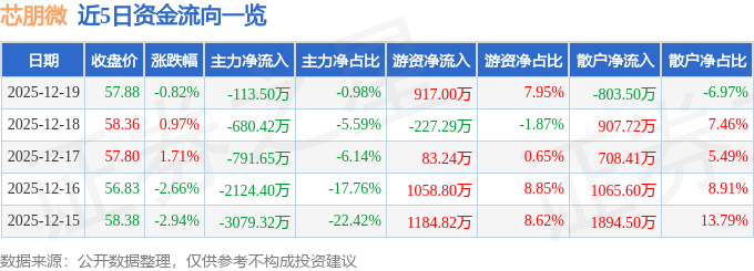 证券之星消息,截至2025年12月19日收盘,芯朋微(688508)报收于57.88元,下跌0.82%,换手率1.5%,成交量1.96万手,成交额1.15亿元。
