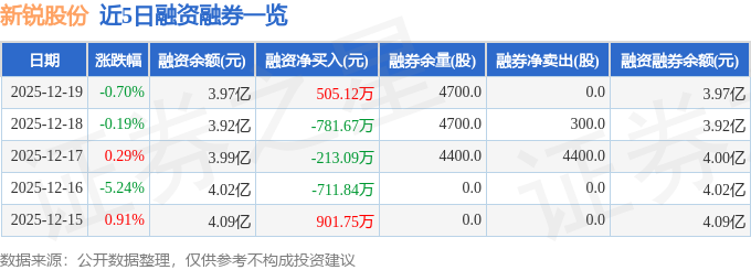 新锐股份融资融券信息显示,融资方面,当日融资买入1736.03万元,融资偿还1230.9万元,融资净买入505.12万元。融券方面,融券卖出0.0股,融券偿还0.0股,融券余量4700.0股,融券余额14.7万元。融资融券余额3.97亿元。