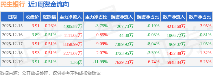 资金流向数据方面,本周民生银行主力资金合计净流出5842.86万元,游资资金合计净流出3736.67万元,散户资金合计净流入9579.53万元。本周资金流向一览见下表: