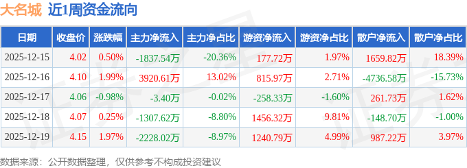 资金流向数据方面,本周大名城主力资金合计净流出1455.97万元,游资资金合计净流入3432.47万元,散户资金合计净流出1976.5万元。本周资金流向一览见下表:
