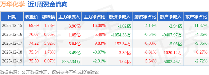 资金流向数据方面,本周万华化学主力资金合计净流入6.01亿元,游资资金合计净流入3.31亿元,散户资金合计净流出9.33亿元。本周资金流向一览见下表: