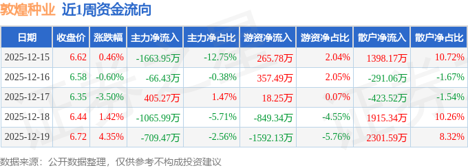 资金流向数据方面,本周敦煌种业主力资金合计净流出3100.57万元,游资资金合计净流出1799.95万元,散户资金合计净流入4900.52万元。本周资金流向一览见下表: