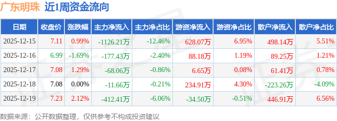 资金流向数据方面,本周广东明珠主力资金合计净流出1795.76万元,游资资金合计净流入923.31万元,散户资金合计净流入872.46万元。本周资金流向一览见下表: