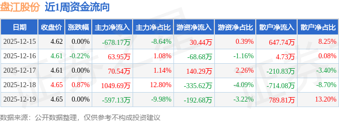 资金流向数据方面,本周盘江股份主力资金合计净流出91.13万元,游资资金合计净流出426.25万元,散户资金合计净流入517.37万元。本周资金流向一览见下表: