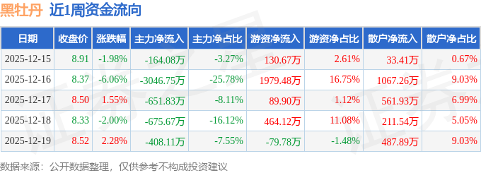 资金流向数据方面,本周黑牡丹主力资金合计净流出4946.43万元,游资资金合计净流入2584.4万元,散户资金合计净流入2362.04万元。本周资金流向一览见下表: