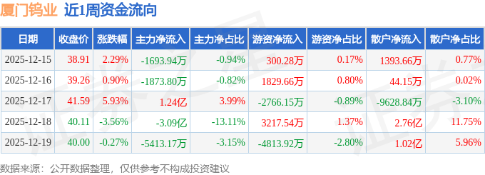 资金流向数据方面,本周厦门钨业主力资金合计净流出2.74亿元,游资资金合计净流出2232.59万元,散户资金合计净流入2.97亿元。本周资金流向一览见下表: