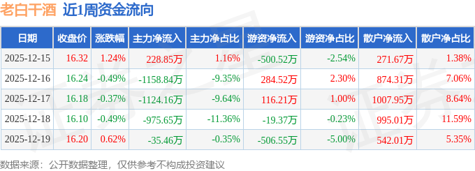 沪深股通持股方面,截止2025年12月19日收盘,老白干酒沪股通持股数为1063.95万股,占流通股比为118.0%。