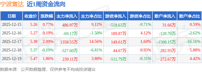 资金流向数据方面,本周宁波富达主力资金合计净流入1687.86万元,游资资金合计净流出646.27万元,散户资金合计净流出1041.59万元。本周资金流向一览见下表: