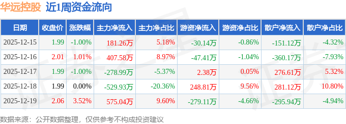 资金流向数据方面,本周华远控股主力资金合计净流入354.96万元,游资资金合计净流出105.47万元,散户资金合计净流出249.49万元。本周资金流向一览见下表: