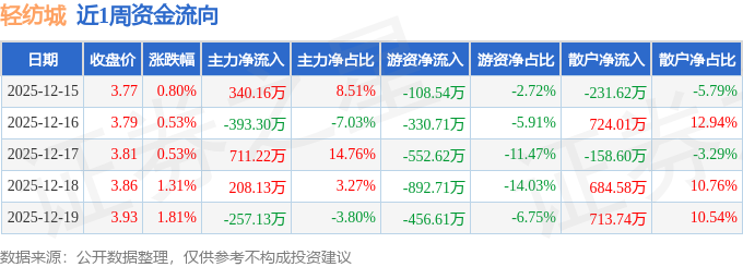 资金流向数据方面,本周轻纺城主力资金合计净流入609.08万元,游资资金合计净流出2341.18万元,散户资金合计净流入1732.1万元。本周资金流向一览见下表: