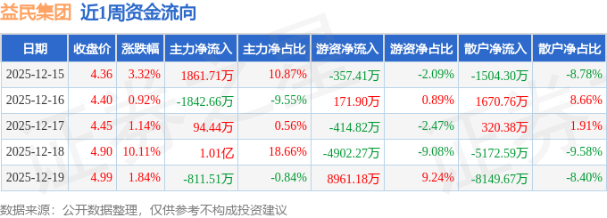 资金流向数据方面,本周益民集团主力资金合计净流入9376.85万元,游资资金合计净流入3458.59万元,散户资金合计净流出1.28亿元。本周资金流向一览见下表: