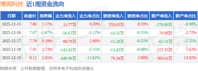 资金流向数据方面,本周博闻科技主力资金合计净流出556.99万元,游资资金合计净流入295.34万元,散户资金合计净流入261.65万元。本周资金流向一览见下表: