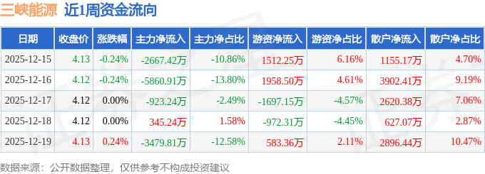 资金流向数据方面,本周三峡能源主力资金合计净流出1.26亿元,游资资金合计净流入1384.66万元,散户资金合计净流入1.12亿元。本周资金流向一览见下表: